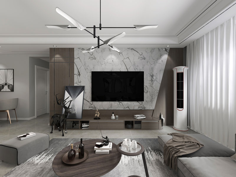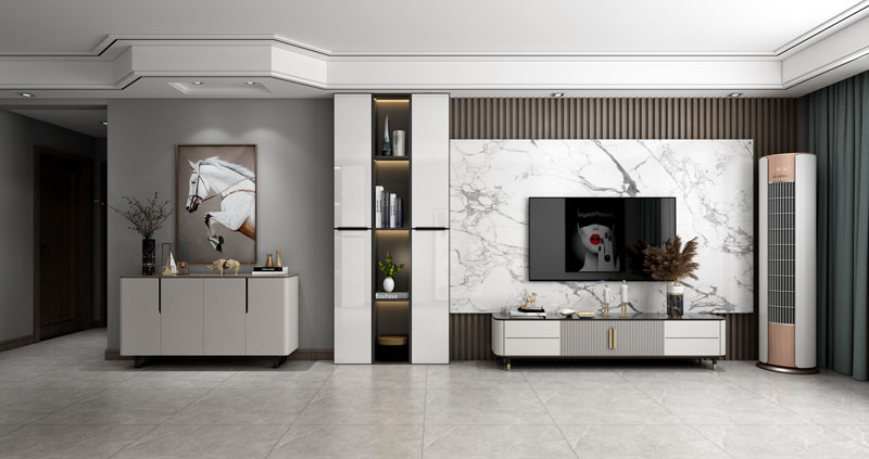 客厅背景墙木饰面及爵士白瓷砖的搭配,赋予其不规则的立体造型,营造出不一样的视觉体验,墙面灰度的配色,让一切都变的和谐宁静。安静的色彩,宁静的空间,忘记了忧愁......