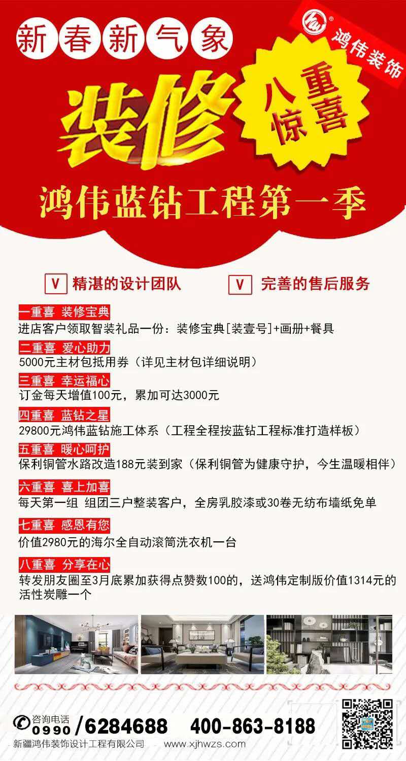 随着各地复工逐步推进,各行各业也在紧锣密鼓做好提前准备,鸿伟装饰作为区域性影响力装饰企业,精心酝酿策划了“新年新气象-八重惊喜礼献全城”活动,同时推出【蓝钻工程第一季】高标准工艺技术回馈客户,以表达多年来对信赖和支持我们的广大客户朋友们的感恩之情。