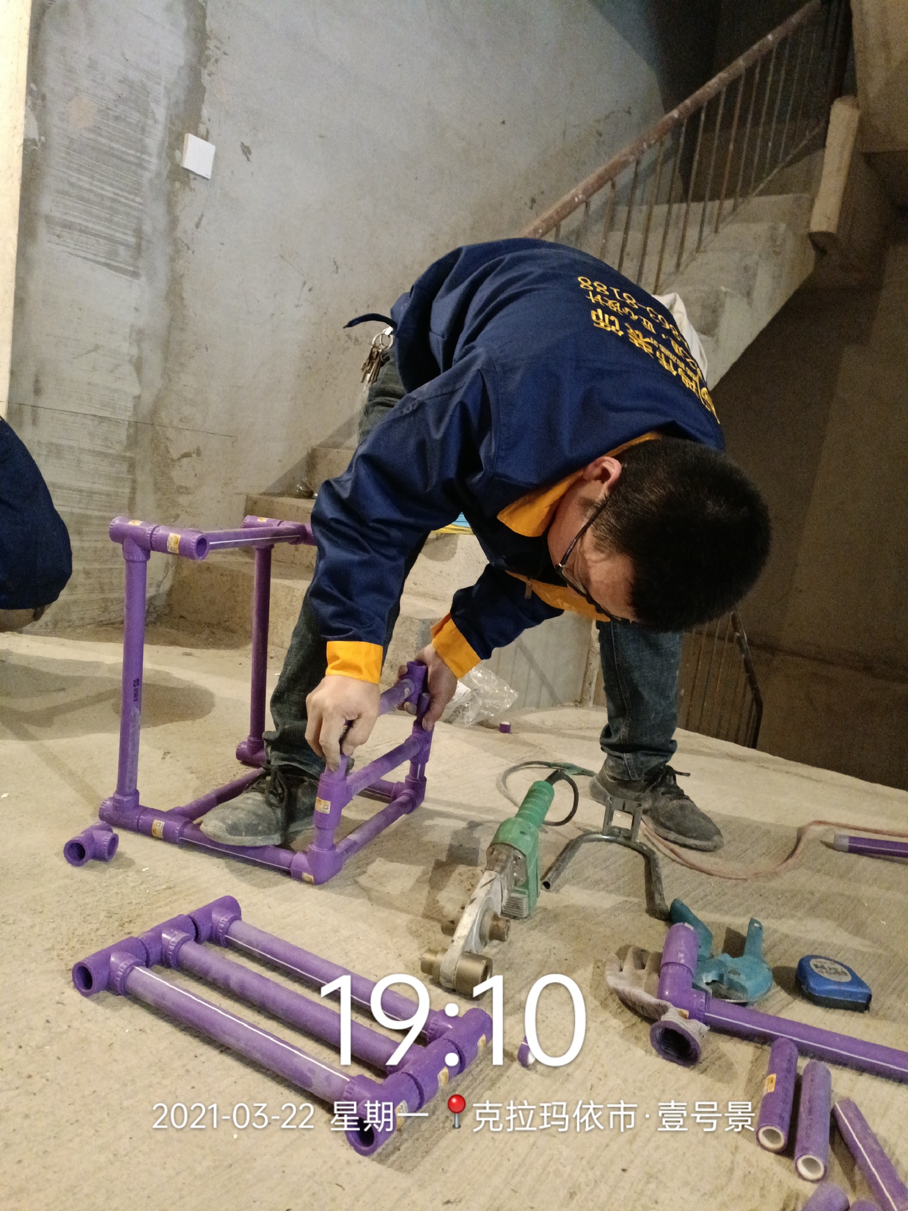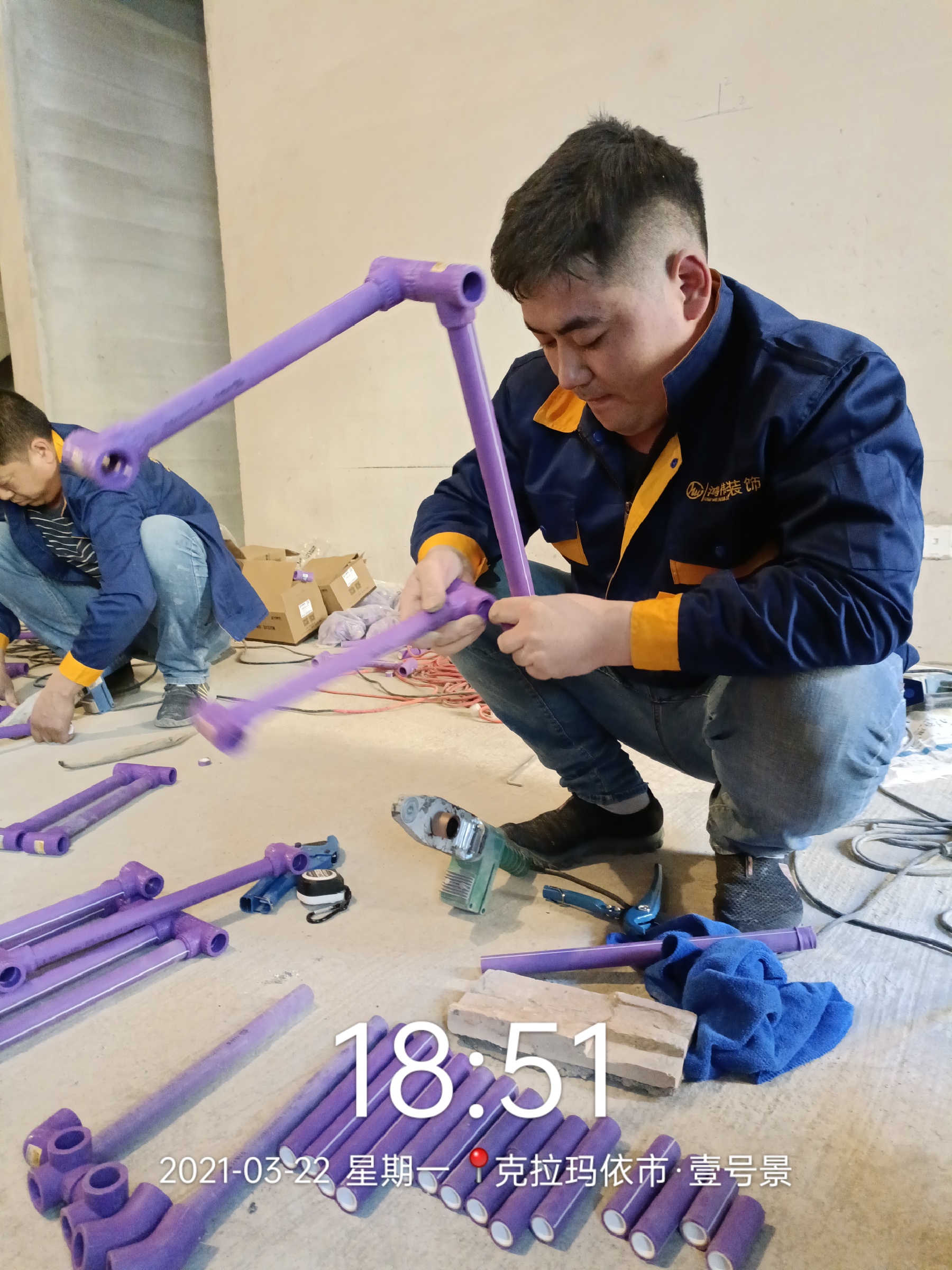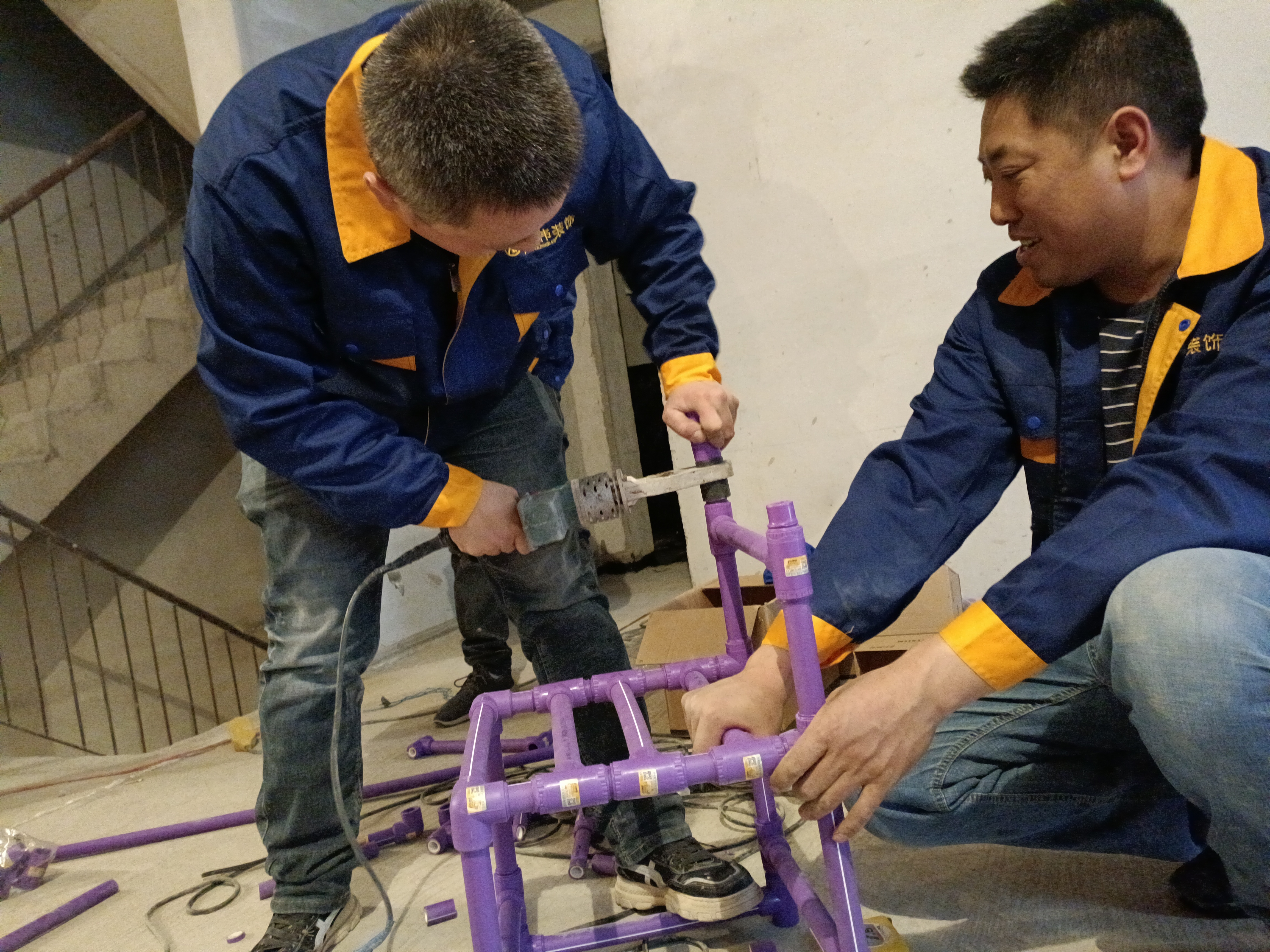早已备好的:管线、三通、等弯三通、90°弯头、45°弯头等一系列配件,在师傅们的手里排着队争先恐后的等着把它们嵌入属于它的位置。
